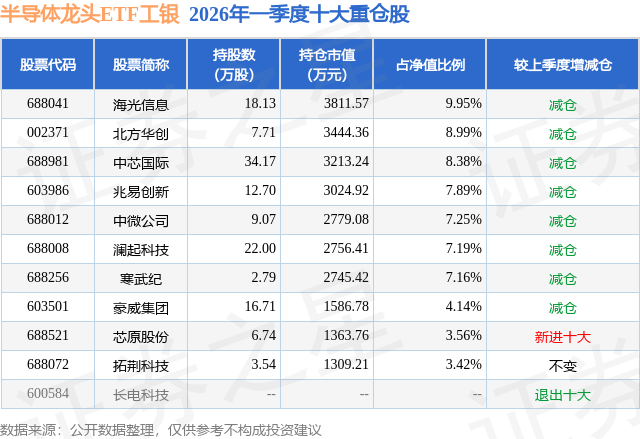从基金规模来看,半导体龙头ETF工银基金2026年一季度公布的基金规模为3.83亿元,较上一期规模4.16亿元变化了-3257.98万元,环比变化了-7.83%。该基金最新一期资产配置为:股票占净值比99.26%,无债券类资产,现金占净值比0.59%。从基金持仓来看,该基金当季前十大股票仓位达67.93%,第一大重仓股为海光信息(688041),持仓占比为9.95%。