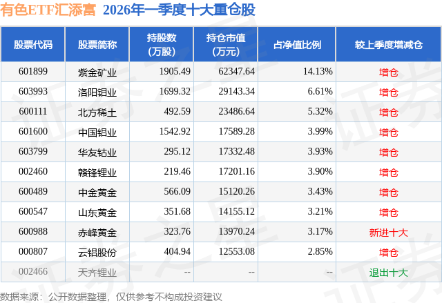 证券之星消息,日前有色ETF汇添富基金公布一季报,2026年一季度最新规模44.12亿元,季度净值涨幅为2.4%。