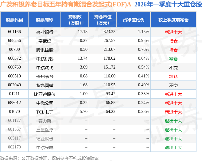 从基金规模来看,广发积极养老目标五年持有期混合发起式(FOF)A基金2026年一季度公布的基金规模为2.53亿元,较上一期规模5262.32万元变化了2.0亿元,环比变化了379.97%。该基金最新一期资产配置为:股票占净值比6.26%,债券占净值比5.38%,现金占净值比2.57%。从基金持仓来看,该基金当季前十大股票仓位达5.65%,第一大重仓股为兴业银行(601166),持仓占比为1.15%。