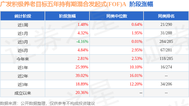 从业绩表现来看,广发积极养老目标五年持有期混合发起式(FOF)A基金过去一年净值涨幅为25.99%,在同类基金中排名16/274,同类基金过去一年净值涨幅中位数为10.1%。而基金过去一年的最大回撤为-13.33%,成立以来的最大回撤为-25.53%。