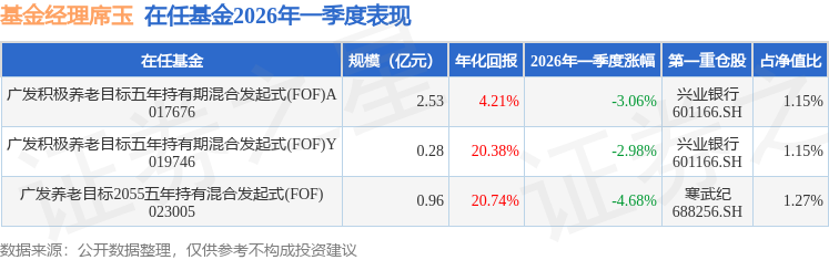 证券之星消息,日前广发积极养老目标五年持有期混合发起式(FOF)A基金公布一季报,2026年一季度最新规模2.53亿元,季度净值涨幅为-3.06%。