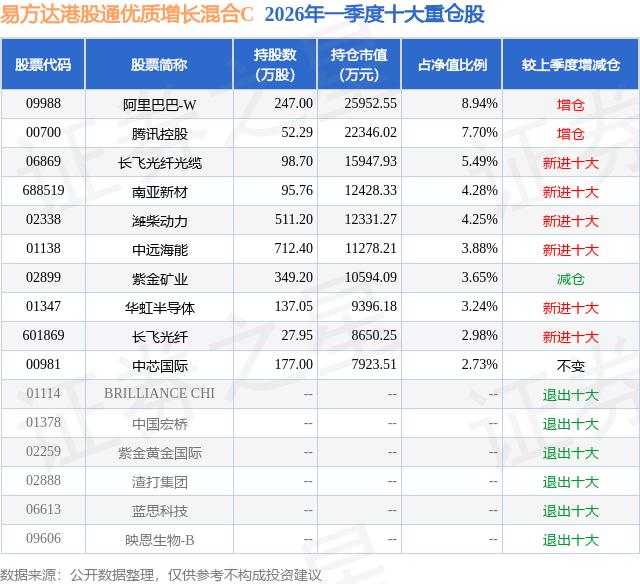 从基金规模来看,易方达港股通优质增长混合C基金2026年一季度公布的基金规模为4.46亿元,较上一期规模8664.1万元变化了3.59亿元,环比变化了414.27%。该基金最新一期资产配置为:股票占净值比92.12%,债券占净值比3.66%,现金占净值比8.33%。从基金持仓来看,该基金当季前十大股票仓位达47.14%,第一大重仓股为阿里巴巴-W(09988),持仓占比为8.94%。