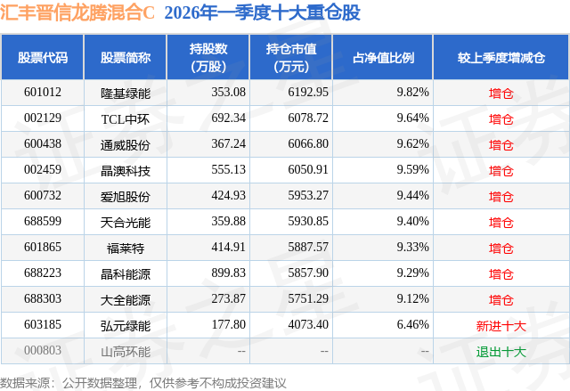 从基金规模来看,汇丰晋信龙腾混合C基金2026年一季度公布的基金规模为2.97亿元,较上一期规模2284.42万元变化了2.74亿元,环比变化了1201.45%。该基金最新一期资产配置为:股票占净值比93.73%,债券占净值比0.1%,现金占净值比6.5%。从基金持仓来看,该基金当季前十大股票仓位达91.71%,第一大重仓股为隆基绿能(601012),持仓占比为9.82%。