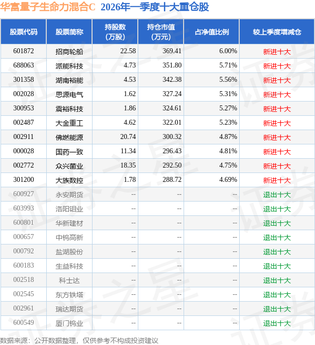 从基金规模来看,华富量子生命力混合C基金2026年一季度公布的基金规模为0.2亿元,较上一期规模112.02万元变化了1861.7万元,环比变化了1661.92%。该基金最新一期资产配置为:股票占净值比93.01%,债券占净值比3.95%,现金占净值比3.73%。从基金持仓来看,该基金当季前十大股票仓位达52.2%,第一大重仓股为招商轮船(601872),持仓占比为6.0%。