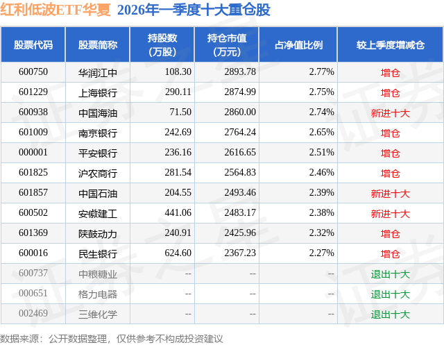 从基金规模来看,红利低波ETF华夏基金2026年一季度公布的基金规模为10.44亿元,较上一期规模8.97亿元变化了1.47亿元,环比变化了16.35%。该基金最新一期资产配置为:股票占净值比99.89%,无债券类资产,现金占净值比0.39%。从基金持仓来看,该基金当季前十大股票仓位达25.24%,第一大重仓股为华润江中(600750),持仓占比为2.77%。