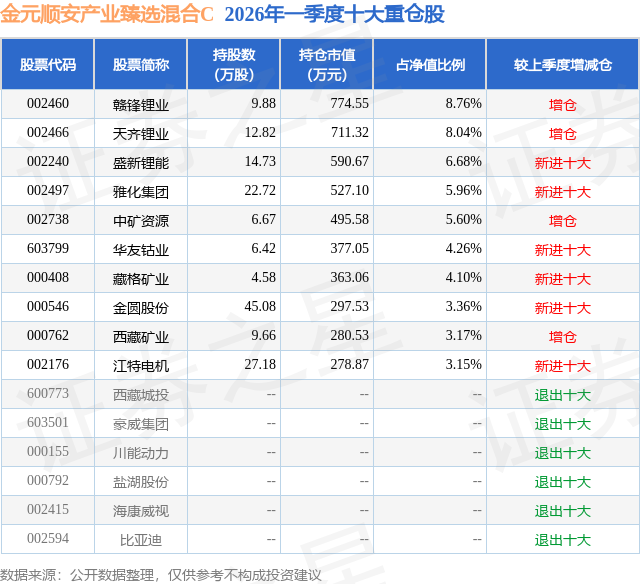 从基金规模来看,金元顺安产业臻选混合C基金2026年一季度公布的基金规模为0.6亿元,较上一期规模4614.95万元变化了1371.96万元,环比变化了29.73%。该基金最新一期资产配置为:股票占净值比91.25%,债券占净值比5.36%,现金占净值比3.36%。从基金持仓来看,该基金当季前十大股票仓位达53.08%,第一大重仓股为赣锋锂业(002460),持仓占比为8.76%。