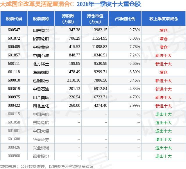 从基金规模来看,大成国企改革灵活配置混合C基金2026年一季度公布的基金规模为2.74亿元,较上一期规模3255.5万元变化了2.41亿元,环比变化了740.75%。该基金最新一期资产配置为:股票占净值比93.61%,无债券类资产,现金占净值比6.23%。从基金持仓来看,该基金当季前十大股票仓位达64.0%,第一大重仓股为山东黄金(600547),持仓占比为9.78%。