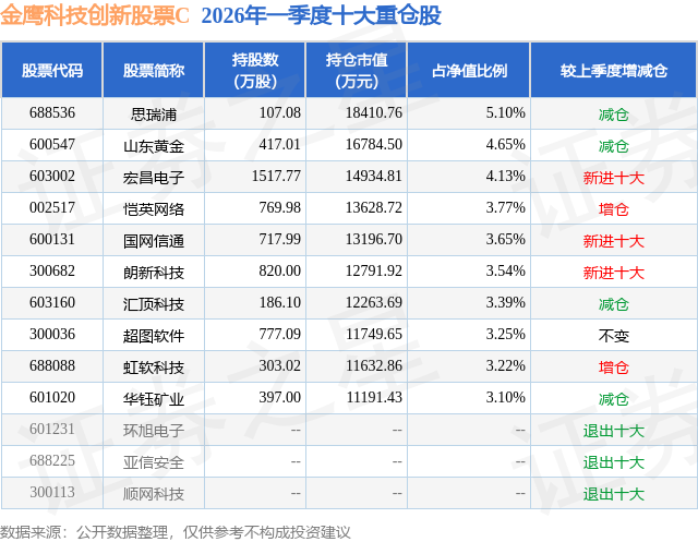 从基金规模来看,金鹰科技创新股票C基金2026年一季度公布的基金规模为12.47亿元,较上一期规模4.35亿元变化了8.12亿元,环比变化了186.72%。该基金最新一期资产配置为:股票占净值比86.78%,无债券类资产,现金占净值比12.33%。从基金持仓来看,该基金当季前十大股票仓位达37.8%,第一大重仓股为思瑞浦(688536),持仓占比为5.1%。