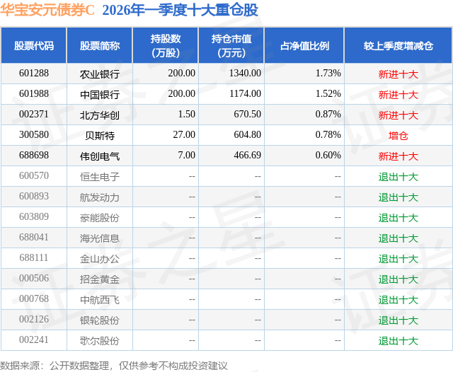 从基金规模来看,华宝安元债券C基金2026年一季度公布的基金规模为2.34亿元,较上一期规模1.75亿元变化了5883.28万元,环比变化了33.68%。该基金最新一期资产配置为:股票占净值比5.51%,债券占净值比89.68%,现金占净值比1.38%。从基金持仓来看,该基金当季前十大股票仓位达5.5%,第一大重仓股为农业银行(601288),持仓占比为1.73%。