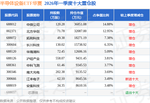 证券之星消息,日前半导体设备ETF华夏基金公布一季报,2026年一季度最新规模24.77亿元,季度净值涨幅为6.38%。