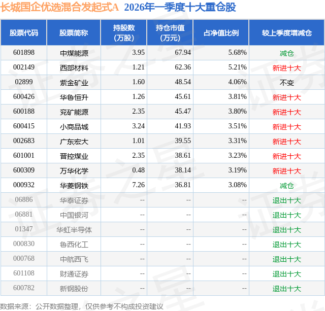 从基金规模来看,长城国企优选混合发起式A基金2026年一季度公布的基金规模为0.12亿元,较上一期规模997.88万元变化了191.29万元,环比变化了19.17%。该基金最新一期资产配置为:股票占净值比90.86%,无债券类资产,现金占净值比9.3%。从基金持仓来看,该基金当季前十大股票仓位达38.88%,第一大重仓股为中煤能源(601898),持仓占比为5.68%。