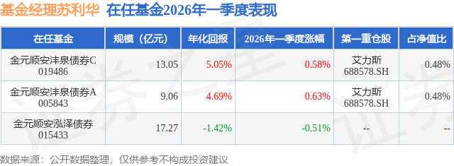 从基金规模来看,金元顺安沣泉债券C基金2026年一季度公布的基金规模为13.05亿元,较上一期规模6275.98万元变化了12.42亿元,环比变化了1979.25%。该基金最新一期资产配置为:股票占净值比18.88%,债券占净值比89.55%,现金占净值比3.07%。从基金持仓来看,该基金当季前十大股票仓位达3.91%,第一大重仓股为艾力斯(688578),持仓占比为0.48%。