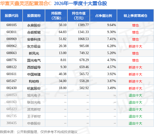 从基金规模来看,华富天鑫灵活配置混合C基金2026年一季度公布的基金规模为1.0亿元,较上一期规模1192.9万元变化了8819.2万元,环比变化了739.31%。该基金最新一期资产配置为:股票占净值比93.85%,无债券类资产,现金占净值比6.84%。从基金持仓来看,该基金当季前十大股票仓位达58.38%,第一大重仓股为永鼎股份(600105),持仓占比为9.64%。