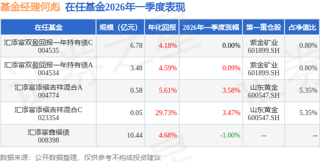 从基金规模来看,汇添富添福吉祥混合A基金2026年一季度公布的基金规模为0.58亿元,较上一期规模5008.16万元变化了764.09万元,环比变化了15.26%。该基金最新一期资产配置为:股票占净值比29.27%,债券占净值比31.05%,现金占净值比39.9%。从基金持仓来看,该基金当季前十大股票仓位达17.53%,第一大重仓股为山东黄金(600547),持仓占比为5.35%。