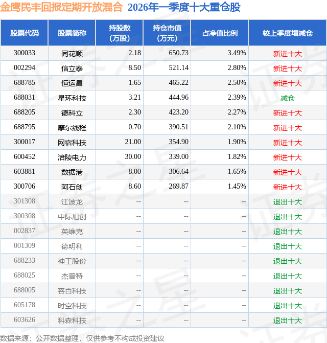 从基金规模来看,金鹰民丰回报定期开放混合基金2026年一季度公布的基金规模为1.86亿元,较上一期规模2.39亿元变化了-5245.22万元,环比变化了-21.96%。该基金最新一期资产配置为:股票占净值比29.04%,债券占净值比71.98%,现金占净值比4.64%。从基金持仓来看,该基金当季前十大股票仓位达22.37%,第一大重仓股为同花顺(300033),持仓占比为3.49%。