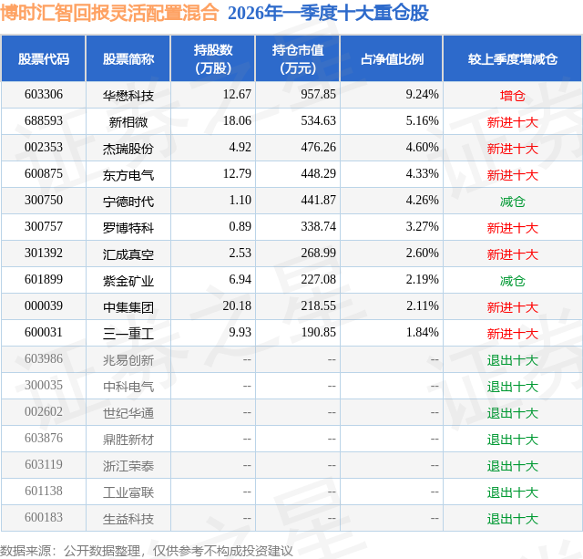 从基金规模来看,博时汇智回报灵活配置混合基金2026年一季度公布的基金规模为1.04亿元,较上一期规模1.5亿元变化了-4625.35万元,环比变化了-30.86%。该基金最新一期资产配置为:股票占净值比44.85%,债券占净值比0.29%,现金占净值比26.07%。从基金持仓来看,该基金当季前十大股票仓位达39.6%,第一大重仓股为华懋科技(603306),持仓占比为9.24%。