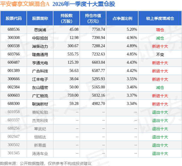 从基金规模来看,平安睿享文娱混合A基金2026年一季度公布的基金规模为10.15亿元,较上一期规模4.84亿元变化了5.32亿元,环比变化了109.93%。该基金最新一期资产配置为:股票占净值比91.2%,债券占净值比0.56%,现金占净值比9.95%。从基金持仓来看,该基金当季前十大股票仓位达42.47%,第一大重仓股为思瑞浦(688536),持仓占比为5.2%。