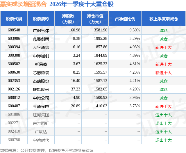 从基金规模来看,嘉实成长增强混合基金2026年一季度公布的基金规模为3.77亿元,较上一期规模4.43亿元变化了-6580.9万元,环比变化了-14.86%。该基金最新一期资产配置为:股票占净值比89.2%,债券占净值比1.71%,现金占净值比9.38%。从基金持仓来看,该基金当季前十大股票仓位达49.29%,第一大重仓股为广钢气体(688548),持仓占比为9.5%。