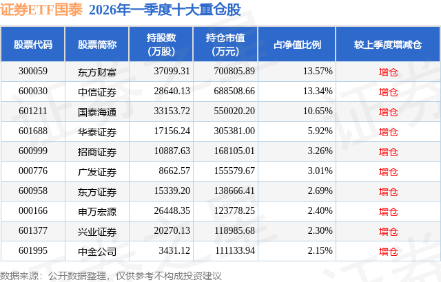 从基金规模来看,证券ETF国泰基金2026年一季度公布的基金规模为516.27亿元,较上一期规模570.29亿元变化了-54.03亿元,环比变化了-9.47%。该基金最新一期资产配置为:股票占净值比99.89%,无债券类资产,现金占净值比0.12%。从基金持仓来看,该基金当季前十大股票仓位达59.29%,第一大重仓股为东方财富(300059),持仓占比为13.57%。