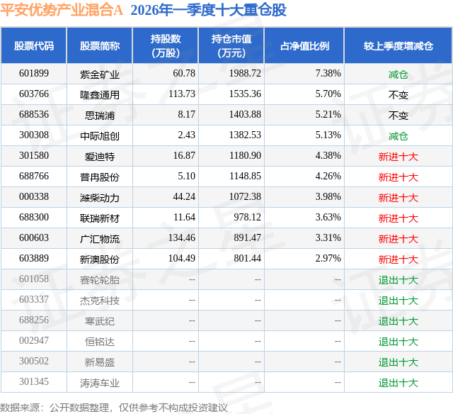 从基金规模来看,平安优势产业混合A基金2026年一季度公布的基金规模为0.85亿元,较上一期规模8646.86万元变化了-175.64万元,环比变化了-2.03%。该基金最新一期资产配置为:股票占净值比91.46%,无债券类资产,现金占净值比8.99%。从基金持仓来看,该基金当季前十大股票仓位达45.95%,第一大重仓股为紫金矿业(601899),持仓占比为7.38%。
