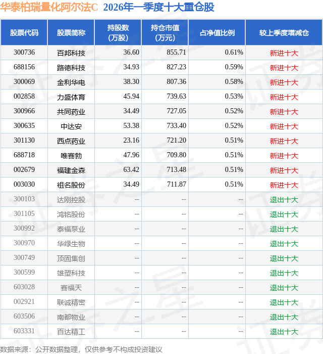 从基金规模来看,华泰柏瑞量化阿尔法C基金2026年一季度公布的基金规模为7.86亿元,较上一期规模124.05万元变化了7.85亿元,环比变化了63253.04%。该基金最新一期资产配置为:股票占净值比81.03%,无债券类资产,现金占净值比17.31%。从基金持仓来看,该基金当季前十大股票仓位达5.39%,第一大重仓股为百邦科技(300736),持仓占比为0.61%。