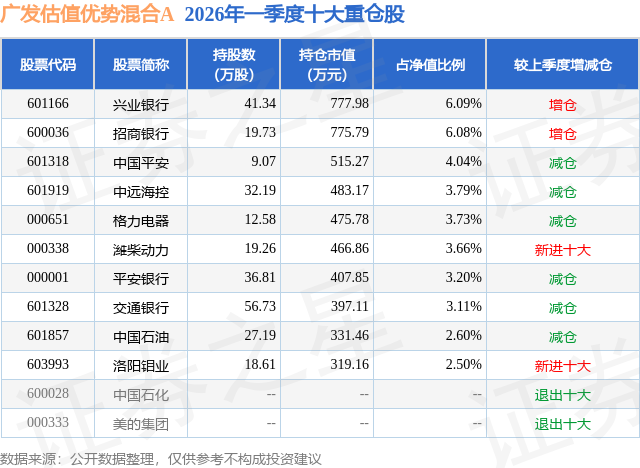 从基金规模来看,广发估值优势混合A基金2026年一季度公布的基金规模为0.85亿元,较上一期规模1.21亿元变化了-3616.67万元,环比变化了-29.83%。该基金最新一期资产配置为:股票占净值比94.25%,债券占净值比4.51%,现金占净值比1.84%。从基金持仓来看,该基金当季前十大股票仓位达38.8%,第一大重仓股为兴业银行(601166),持仓占比为6.09%。