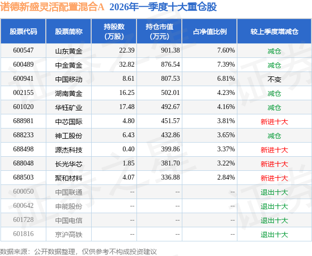 从基金规模来看,诺德新盛灵活配置混合A基金2026年一季度公布的基金规模为0.02亿元,较上一期规模345.41万元变化了-146.33万元,环比变化了-42.36%。该基金最新一期资产配置为:股票占净值比92.11%,无债券类资产,现金占净值比8.16%。从基金持仓来看,该基金当季前十大股票仓位达47.08%,第一大重仓股为山东黄金(600547),持仓占比为7.6%。