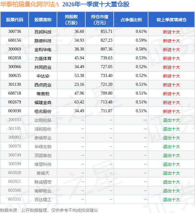 从基金规模来看,华泰柏瑞量化阿尔法A基金2026年一季度公布的基金规模为6.18亿元,较上一期规模1.49亿元变化了4.68亿元,环比变化了313.96%。该基金最新一期资产配置为:股票占净值比81.03%,无债券类资产,现金占净值比17.31%。从基金持仓来看,该基金当季前十大股票仓位达5.39%,第一大重仓股为百邦科技(300736),持仓占比为0.61%。