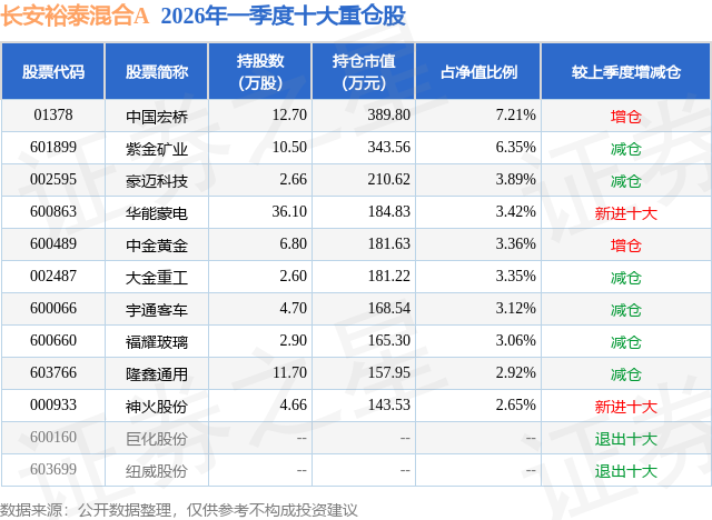 从基金规模来看,长安裕泰混合A基金2026年一季度公布的基金规模为0.32亿元,较上一期规模3585.49万元变化了-384.1万元,环比变化了-10.71%。该基金最新一期资产配置为:股票占净值比80.92%,无债券类资产,现金占净值比13.68%。从基金持仓来看,该基金当季前十大股票仓位达39.33%,第一大重仓股为中国宏桥(01378),持仓占比为7.21%。