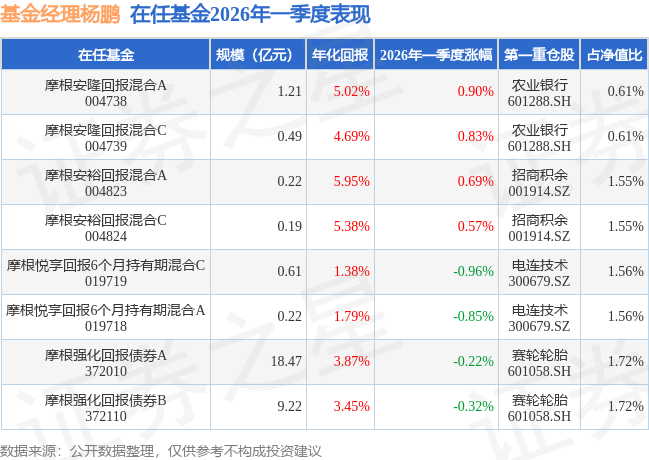 证券之星消息,日前摩根安隆回报混合A基金公布一季报,2026年一季度最新规模1.21亿元,季度净值涨幅为0.9%。
