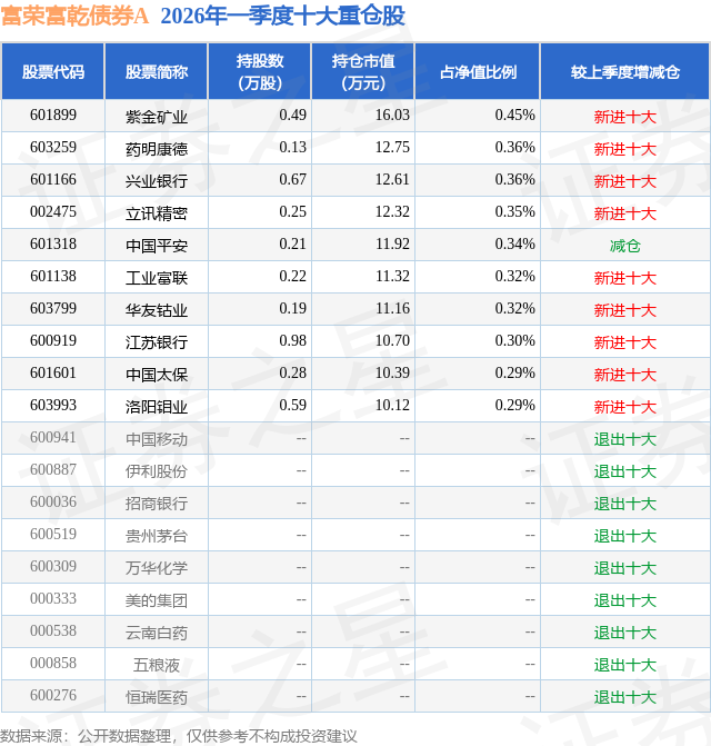 从基金规模来看,富荣富乾债券A基金2026年一季度公布的基金规模为0.34亿元,较上一期规模1.02亿元变化了-6786.4万元,环比变化了-66.62%。该基金最新一期资产配置为:股票占净值比18.92%,债券占净值比102.01%,现金占净值比0.68%。从基金持仓来看,该基金当季前十大股票仓位达3.38%,第一大重仓股为紫金矿业(601899),持仓占比为0.45%。