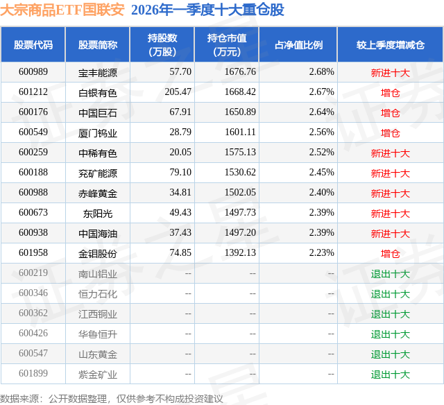 从基金规模来看,大宗商品ETF国联安基金2026年一季度公布的基金规模为6.25亿元,较上一期规模3.22亿元变化了3.03亿元,环比变化了94.06%。该基金最新一期资产配置为:股票占净值比98.51%,无债券类资产,现金占净值比1.67%。从基金持仓来看,该基金当季前十大股票仓位达24.93%,第一大重仓股为宝丰能源(600989),持仓占比为2.68%。