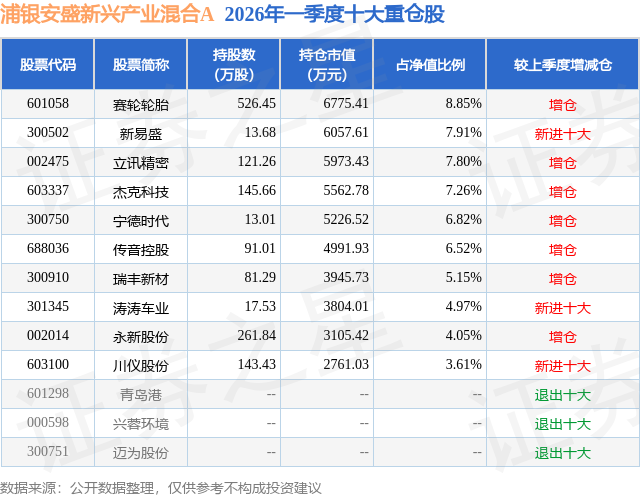 从基金规模来看,浦银安盛新兴产业混合A基金2026年一季度公布的基金规模为3.95亿元,较上一期规模4.03亿元变化了-778.22万元,环比变化了-1.93%。该基金最新一期资产配置为:股票占净值比93.88%,债券占净值比5.45%,现金占净值比1.13%。从基金持仓来看,该基金当季前十大股票仓位达62.94%,第一大重仓股为赛轮轮胎(601058),持仓占比为8.85%。