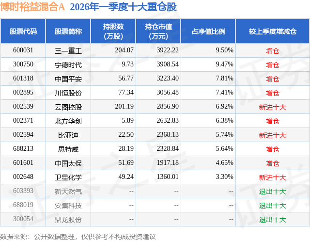从基金规模来看,博时裕益混合A基金2026年一季度公布的基金规模为1.4亿元,较上一期规模1.18亿元变化了2220.33万元,环比变化了18.89%。该基金最新一期资产配置为:股票占净值比89.44%,债券占净值比0.12%,现金占净值比7.22%。从基金持仓来看,该基金当季前十大股票仓位达66.82%,第一大重仓股为三一重工(600031),持仓占比为9.5%。