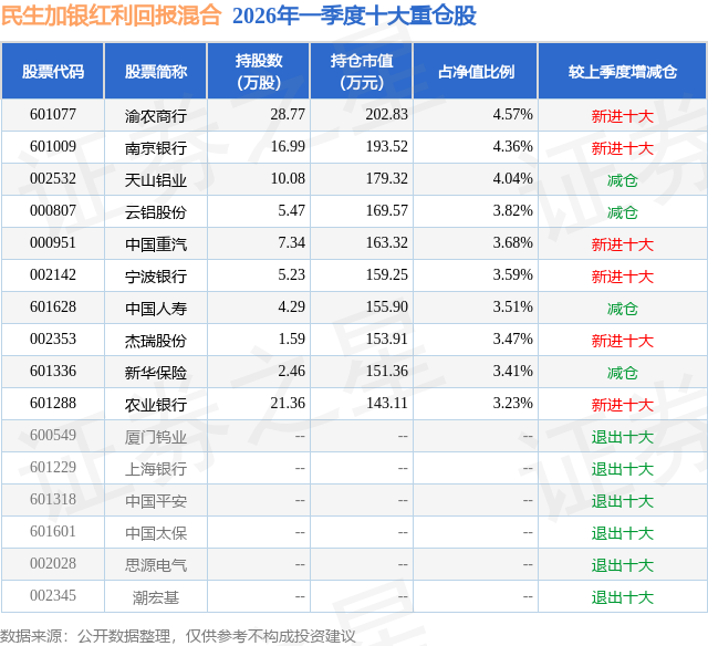 从基金规模来看,民生加银红利回报混合基金2026年一季度公布的基金规模为0.44亿元,较上一期规模5511.35万元变化了-1073.8万元,环比变化了-19.48%。该基金最新一期资产配置为:股票占净值比74.89%,债券占净值比18.86%,现金占净值比8.95%。从基金持仓来看,该基金当季前十大股票仓位达37.68%,第一大重仓股为渝农商行(601077),持仓占比为4.57%。