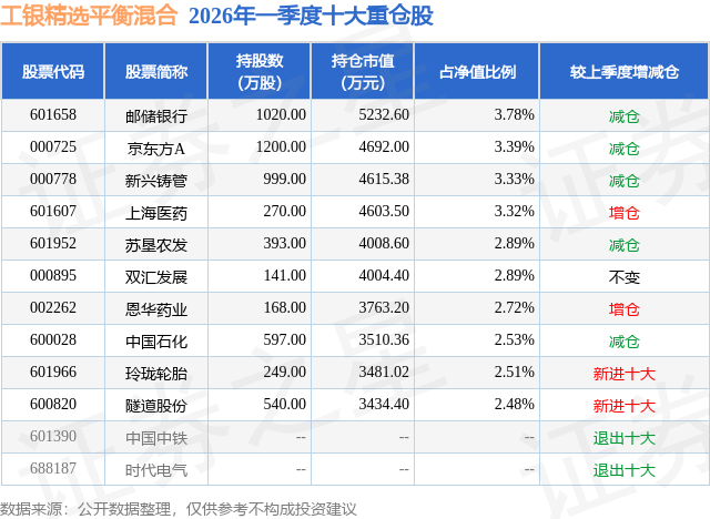 从基金规模来看,工银精选平衡混合基金2026年一季度公布的基金规模为13.86亿元,较上一期规模24.55亿元变化了-10.7亿元,环比变化了-43.57%。该基金最新一期资产配置为:股票占净值比62.0%,债券占净值比23.02%,现金占净值比15.33%。从基金持仓来看,该基金当季前十大股票仓位达29.84%,第一大重仓股为邮储银行(601658),持仓占比为3.78%。