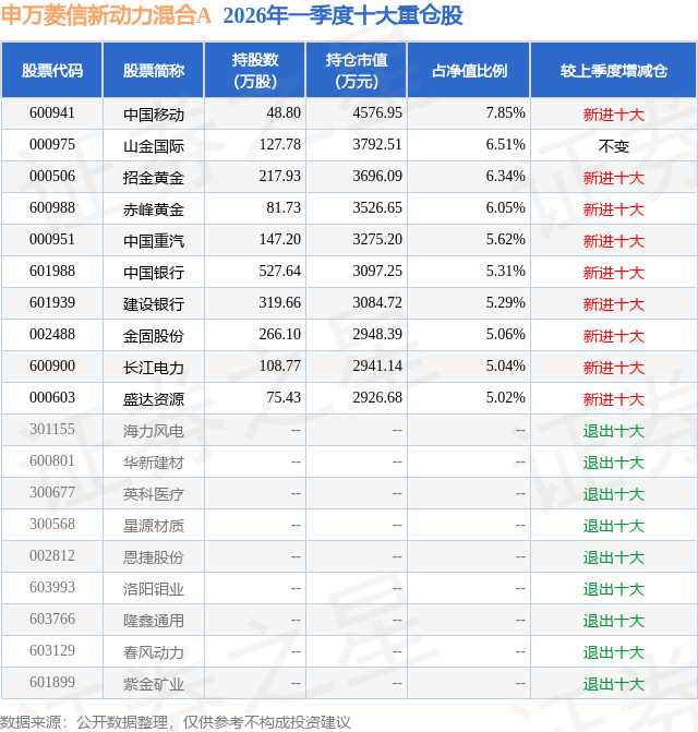 从基金规模来看,申万菱信新动力混合A基金2026年一季度公布的基金规模为4.21亿元,较上一期规模10.06亿元变化了-5.85亿元,环比变化了-58.17%。该基金最新一期资产配置为:股票占净值比91.06%,债券占净值比4.75%,现金占净值比3.62%。从基金持仓来看,该基金当季前十大股票仓位达58.09%,第一大重仓股为中国移动(600941),持仓占比为7.85%。