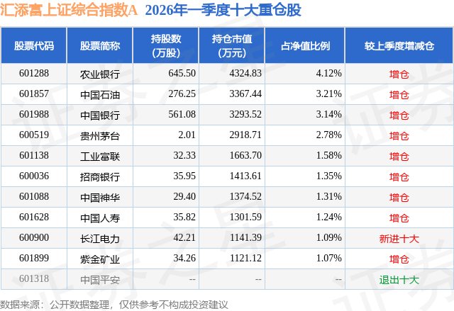 从基金规模来看,汇添富上证综合指数A基金2026年一季度公布的基金规模为9.35亿元,较上一期规模9.94亿元变化了-5862.03万元,环比变化了-5.9%。该基金最新一期资产配置为:股票占净值比94.51%,债券占净值比2.34%,现金占净值比3.26%。从基金持仓来看,该基金当季前十大股票仓位达20.89%,第一大重仓股为农业银行(601288),持仓占比为4.12%。