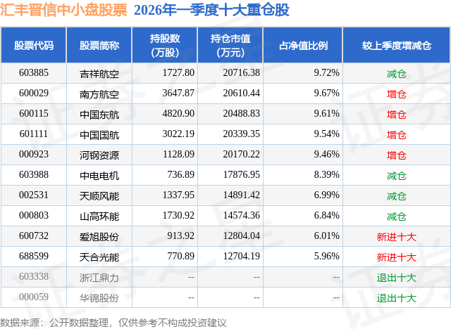 从基金规模来看,汇丰晋信中小盘股票基金2026年一季度公布的基金规模为21.31亿元,较上一期规模2.01亿元变化了19.3亿元,环比变化了959.17%。该基金最新一期资产配置为:股票占净值比94.42%,无债券类资产,现金占净值比6.7%。从基金持仓来看,该基金当季前十大股票仓位达82.19%,第一大重仓股为吉祥航空(603885),持仓占比为9.72%。