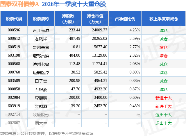 从基金规模来看,国泰双利债券A基金2026年一季度公布的基金规模为46.22亿元,较上一期规模26.84亿元变化了19.39亿元,环比变化了72.23%。该基金最新一期资产配置为:股票占净值比19.87%,债券占净值比81.58%,现金占净值比0.65%。从基金持仓来看,该基金当季前十大股票仓位达18.68%,第一大重仓股为古井贡酒(000596),持仓占比为4.25%。