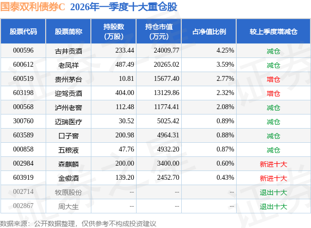 从基金规模来看,国泰双利债券C基金2026年一季度公布的基金规模为10.3亿元,较上一期规模13.71亿元变化了-3.41亿元,环比变化了-24.87%。该基金最新一期资产配置为:股票占净值比19.87%,债券占净值比81.58%,现金占净值比0.65%。从基金持仓来看,该基金当季前十大股票仓位达18.68%,第一大重仓股为古井贡酒(000596),持仓占比为4.25%。