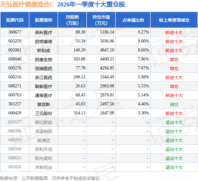 证券之星消息,日前天弘医疗健康混合C基金公布一季报,2026年一季度最新规模3.0亿元,季度净值涨幅为0.01%。