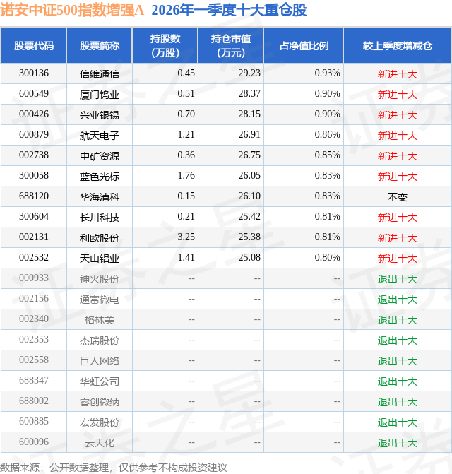 证券之星消息,日前诺安中证500指数增强A基金公布一季报,2026年一季度最新规模0.28亿元,季度净值涨幅为2.52%。