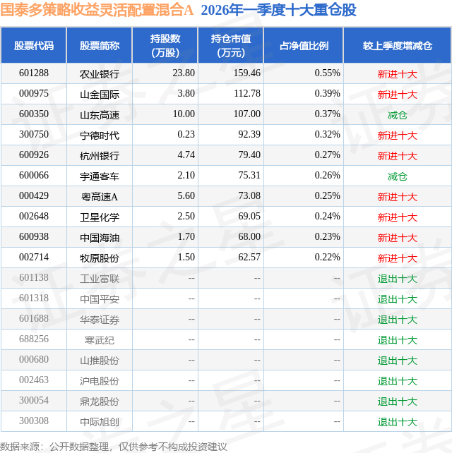 证券之星消息,日前国泰多策略收益灵活配置混合A基金公布一季报,2026年一季度最新规模1.19亿元,季度净值涨幅为0.58%。