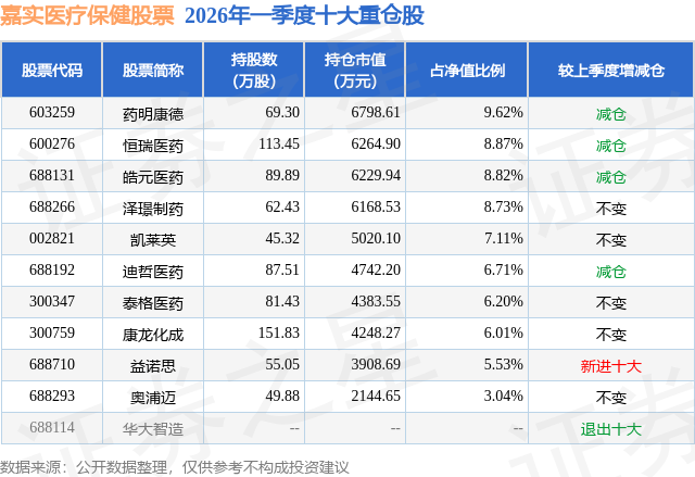 从基金规模来看,嘉实医疗保健股票基金2026年一季度公布的基金规模为7.06亿元,较上一期规模7.4亿元变化了-3371.5万元,环比变化了-4.56%。该基金最新一期资产配置为:股票占净值比93.76%,债券占净值比5.74%,现金占净值比0.63%。从基金持仓来看,该基金当季前十大股票仓位达70.64%,第一大重仓股为药明康德(603259),持仓占比为9.62%。