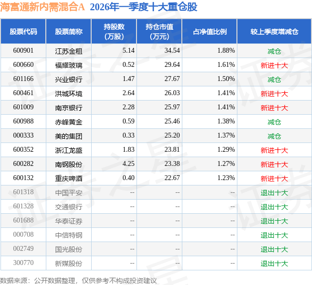 从基金规模来看,海富通新内需混合A基金2026年一季度公布的基金规模为0.04亿元,较上一期规模442.55万元变化了-71.62万元,环比变化了-16.18%。该基金最新一期资产配置为:股票占净值比34.84%,债券占净值比63.92%,现金占净值比1.81%。从基金持仓来看,该基金当季前十大股票仓位达14.35%,第一大重仓股为江苏金租(600901),持仓占比为1.88%。
