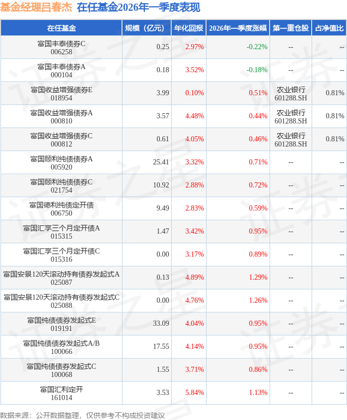 证券之星消息,日前富国收益增强债券C基金公布一季报,2026年一季度最新规模0.61亿元,季度净值涨幅为0.46%。