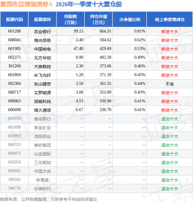 从基金规模来看,富国收益增强债券A基金2026年一季度公布的基金规模为3.57亿元,较上一期规模2.63亿元变化了9412.68万元,环比变化了35.84%。该基金最新一期资产配置为:股票占净值比16.23%,债券占净值比82.58%,现金占净值比3.86%。从基金持仓来看,该基金当季前十大股票仓位达5.05%,第一大重仓股为农业银行(601288),持仓占比为0.81%。