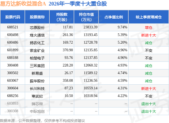 从基金规模来看,易方达新收益混合A基金2026年一季度公布的基金规模为19.64亿元,较上一期规模29.5亿元变化了-9.86亿元,环比变化了-33.43%。该基金最新一期资产配置为:股票占净值比92.89%,债券占净值比6.54%,现金占净值比0.3%。从基金持仓来看,该基金当季前十大股票仓位达53.04%,第一大重仓股为芯原股份(688521),持仓占比为9.74%。