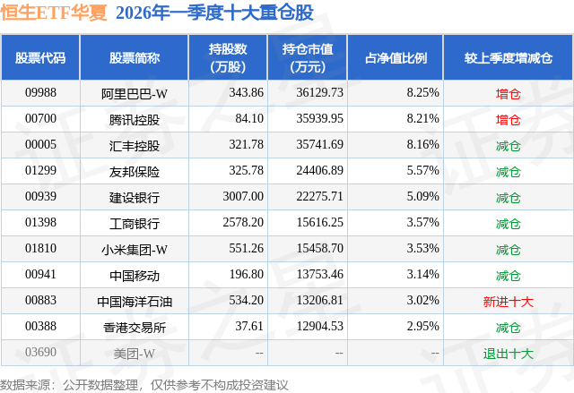 从基金规模来看,恒生ETF华夏基金2026年一季度公布的基金规模为43.8亿元,较上一期规模46.37亿元变化了-2.57亿元,环比变化了-5.55%。该基金最新一期资产配置为:股票占净值比98.48%,无债券类资产,现金占净值比1.4%。从基金持仓来看,该基金当季前十大股票仓位达51.49%,第一大重仓股为阿里巴巴-W(09988),持仓占比为8.25%。